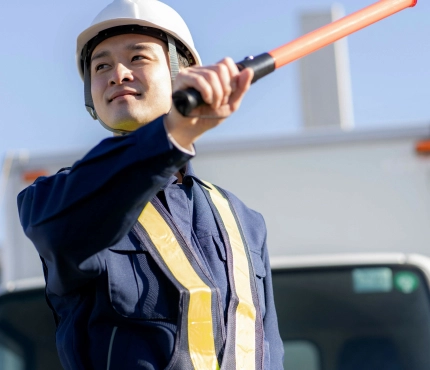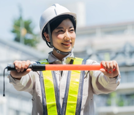 電気・電話・水道・ガス・道路・建築などの様々な工事において、一般通行者や作業員の方などあらゆる人の安全を確保します。通行車両・作業車両の誘導や歩行者への案内業務などを実施し、安全で安心できる現場作業の進行と円滑な通行をサポートします。